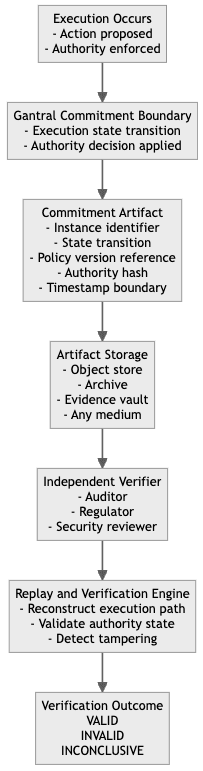 Verification relies only on the commitment artifact and public execution semantics. It does not require access to Gantral systems, operator credentials, or internal databases.